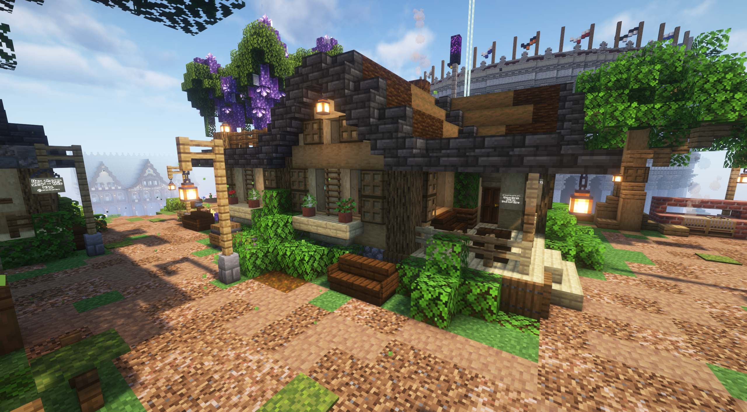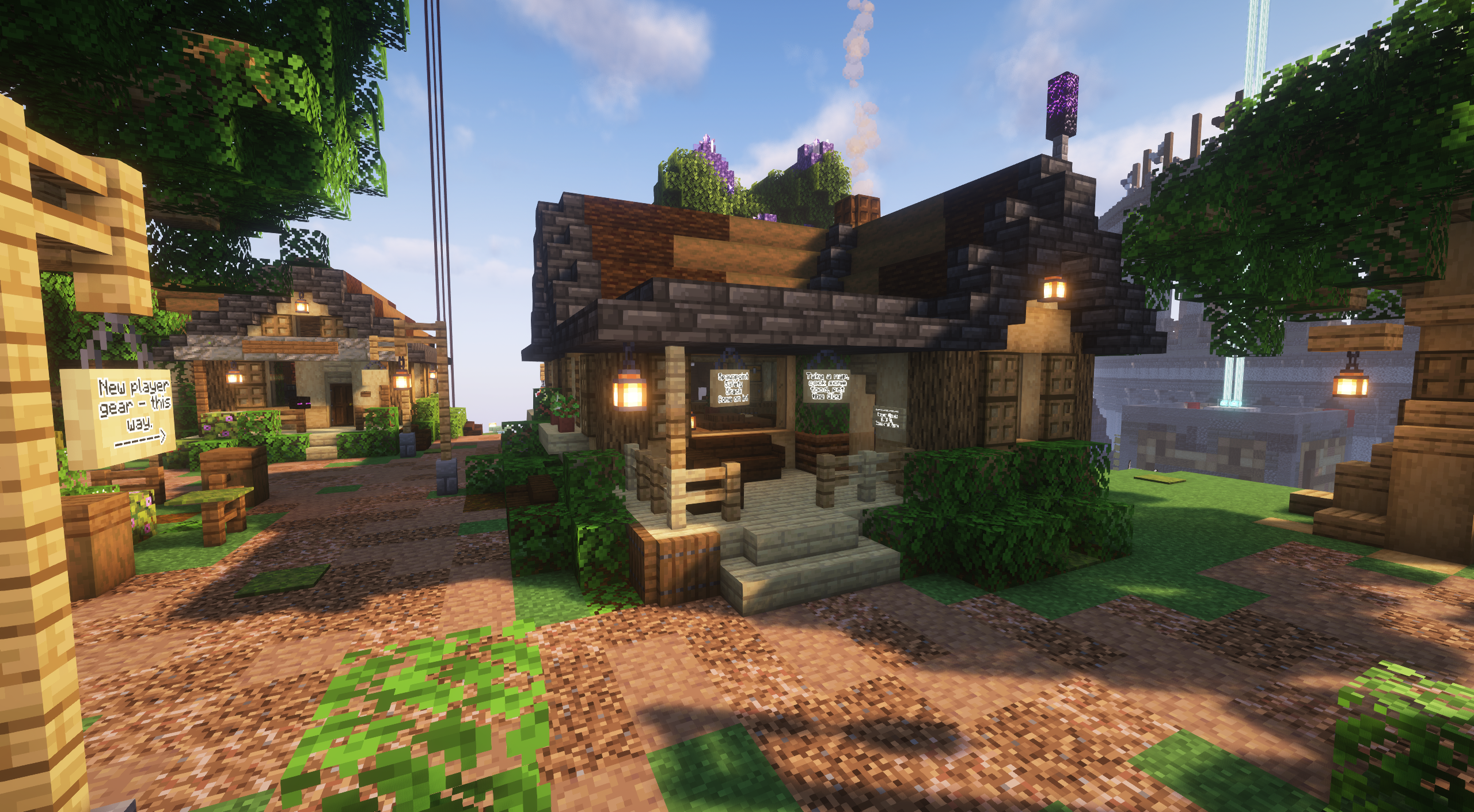 Around spawn, a shopping district is used to display and sell items to other players. The main currency is diamonds, and more information regarding our shopping and currency process can be found here.
